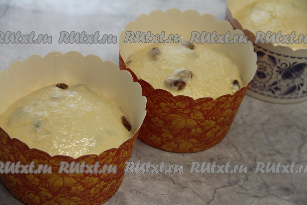 По прошествии времени сдобное дрожжевое тесто увеличится в объёме раза в 2. Обмять тесто и разделить его на три части. Выложить тесто в формы для куличей, заполняя их на 2/3 объёма, и оставить в тёплом месте ещё на 1 час.