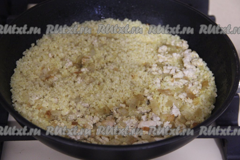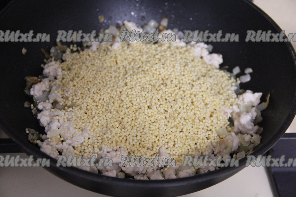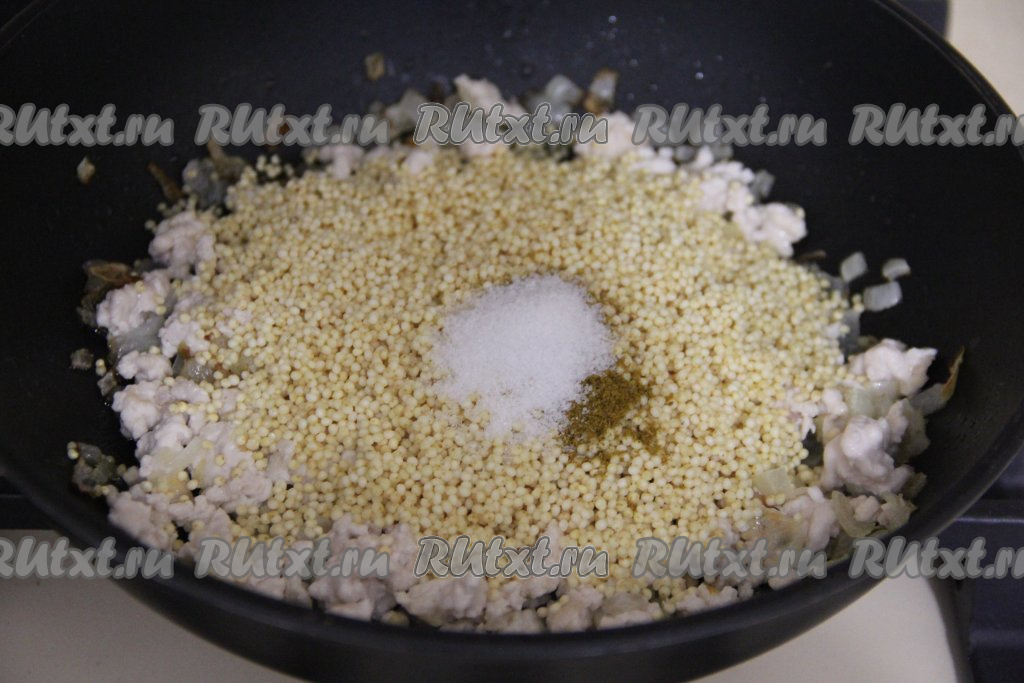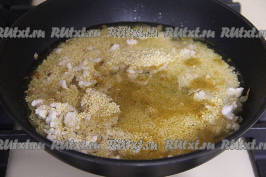 Пшено хорошо промыть под проточной водой, после этого переложить в сито, оставить на пару минут, чтобы убрать лишнюю воду. Добавить пшено в сковороду.