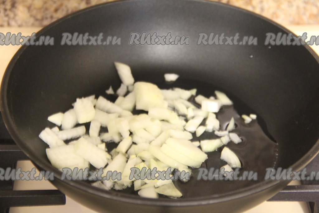Влить в сковороду растительное масло, немного прогреть его и выложить лук.