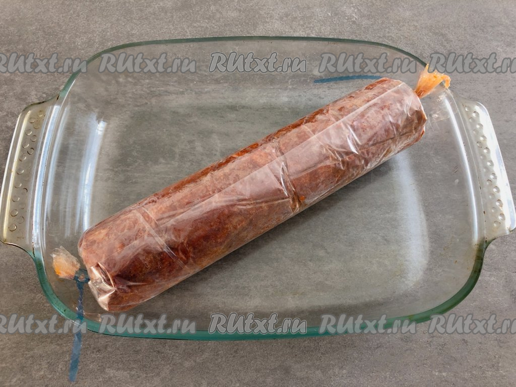 Перекладываем получившуюся колбаску в форму для запекания и отправляем в духовку, разогретую до 120 градусов, на 1,5 часа.