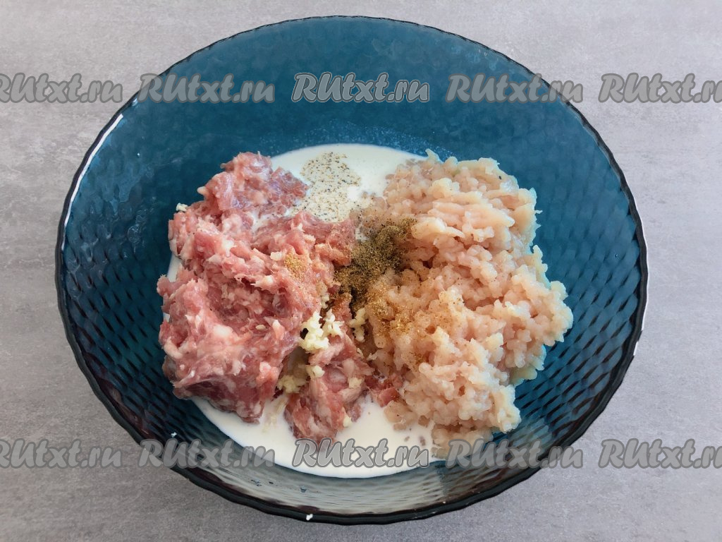 Чеснок очищаем. В глубокую миску выкладываем фарш, добавляем пропущенный через пресс (или натёртый на мелкой терке) чеснок, вливаем сливки, всыпаем соль, молотый кориандр, чёрный молотый перец (можно добавить и другие ваши любимые специи).