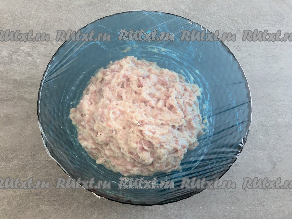 Накрываем миску с фаршем пищевой плёнкой и убираем в холодильник на 3 часа.