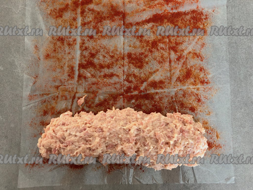 Затем на узкую сторону, посыпанную паприкой, выкладываем полоской фарш, как на фото, немного отступив от края с каждой стороны.