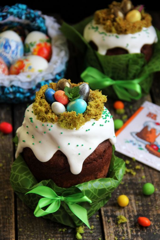 Готовые куличи полностью остудить, а затем украсить по желанию. Я покрыла куличи покупной сахарной глазурью и украсила бисквитными гнёздами с цветными конфетками, а также кондитерской посыпкой. Шоколадные куличи, приготовленные с добавлением вяленой вишни, получаются необыкновенно вкусными, воздушными и ароматными, рекомендую!