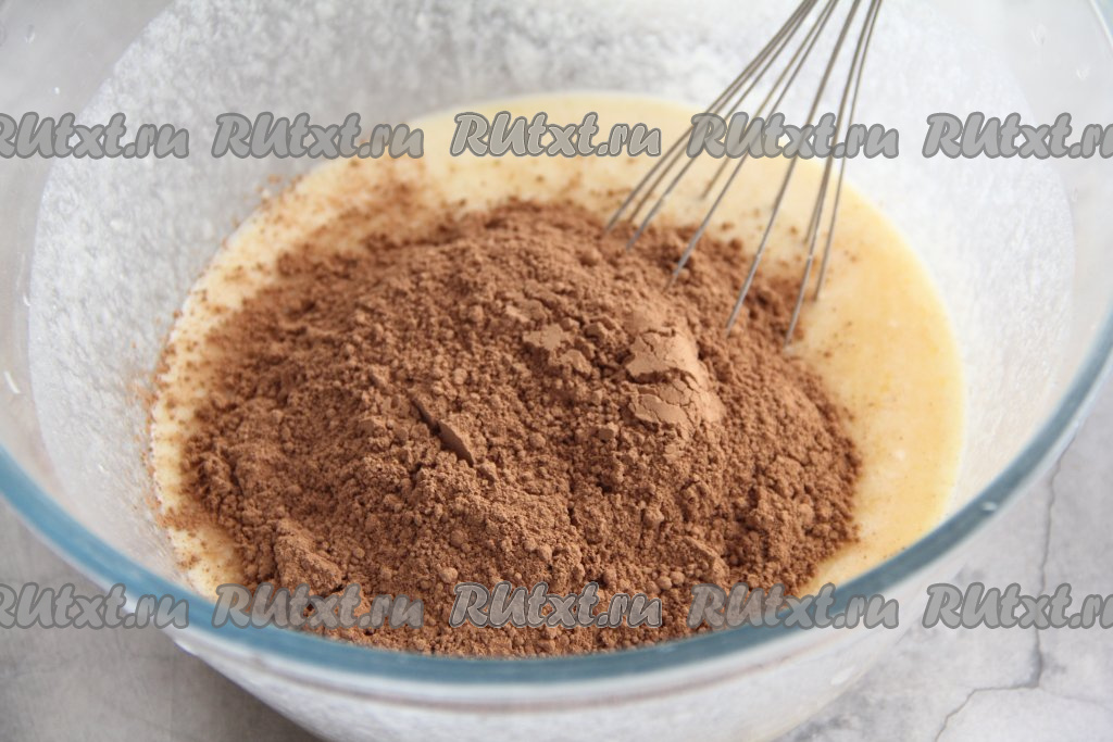 В глубокой миске соединить яйца, получившуюся опару, сахар и растопленное сливочное масло комнатной температуры, перемешать венчиком.