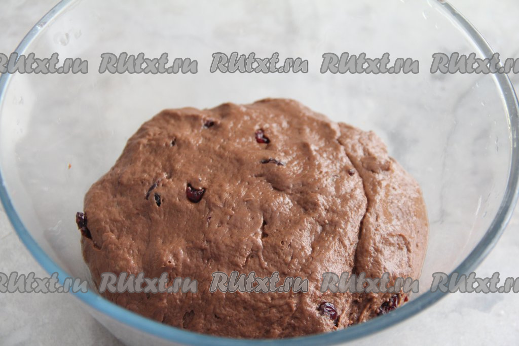 А затем вымесить шоколадное тесто руками, всыпая по мере необходимости муку. Добавляя муку, учитывайте, что тесто для этого кулича должно получиться мягким, нежным, слегка липнущим. В замешанное тесто добавить вяленую вишню и тщательно вмешать её. Миску с шоколадным тестом с вишней прикрыть полотенцем и на 1,5 часа поставить в тёплое место без сквозняков. За это время тесто хорошо округлится и увеличится в объёме раза в 2.