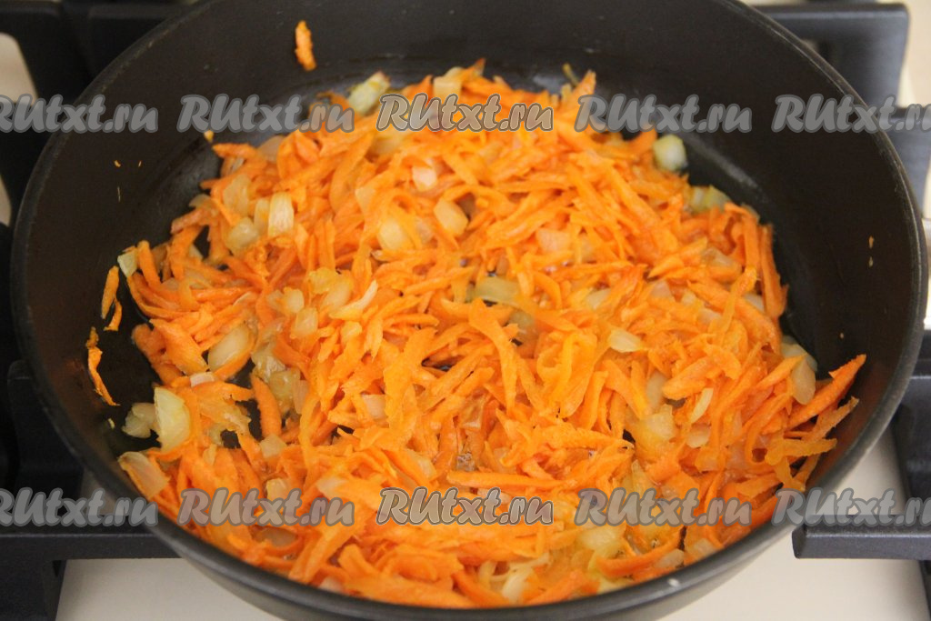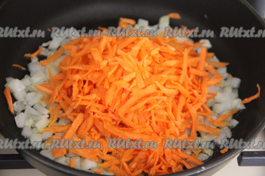 Когда лук станет достаточно мягким, добавить к нему очищенную и натёртую на крупной тёрке морковку.
