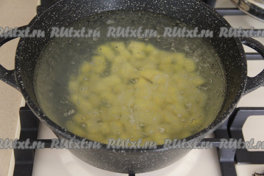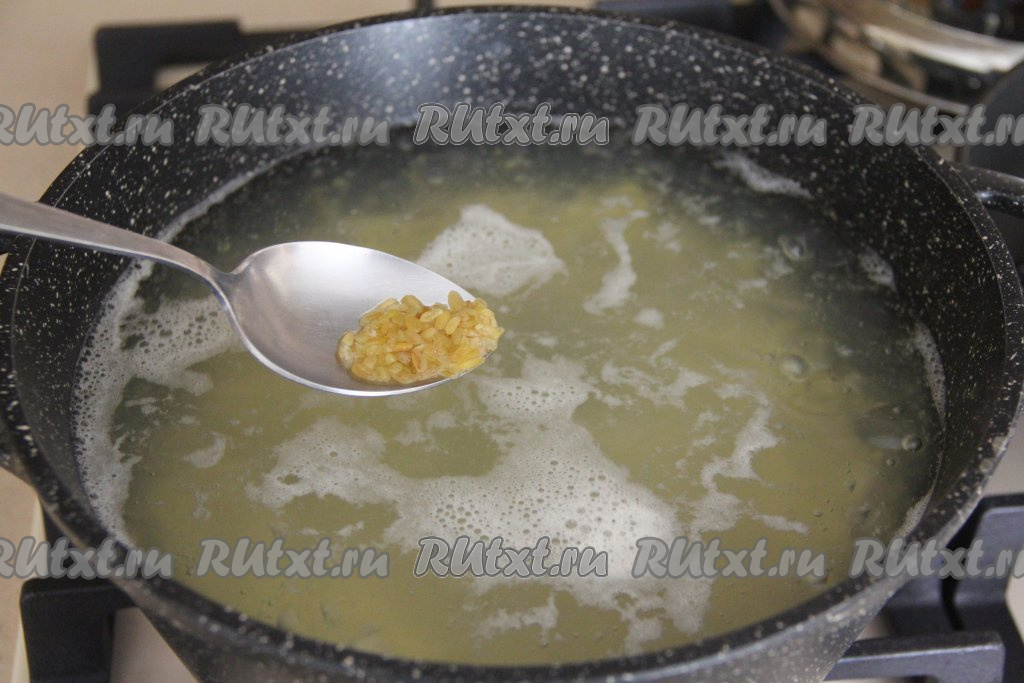 Как только вода с картофелем закипит, сразу всыпать в кастрюлю булгур, перемешать, после закипания уменьшить огонь и варить 10 минут.