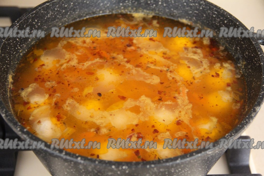После того как фрикадельки проварятся 10 минут, добавить в кастрюлю обжаренные овощи и любимые специи, посолить, дать закипеть, а затем проварить 5 минут на небольшом огне.