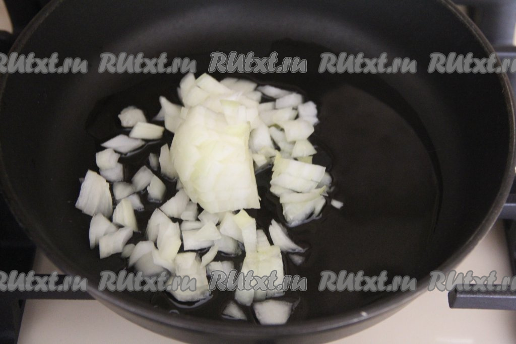 Пока фрикадельки варятся, обжарим овощи. Для этого в сковороду нужно влить растительное масло, прогреть его. В разогретое масло выложить очищенную и мелко нарезанную луковицу, обжаривать её минуты 3-4 (до мягкости) на среднем огне, время от времени перемешивая.