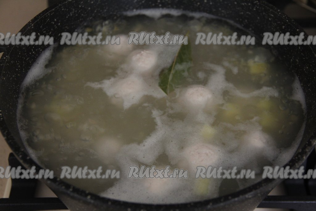 После того как булгур проварится 10 минут, выложить в кастрюлю фрикадельки и лавровый лист, дать супу закипеть, а после этого варить на небольшом огне 10 минут.