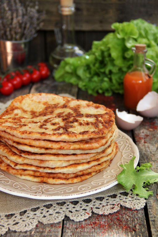 В сковороду влить масло и разогреть. Выложить лепёшку, жарить с двух сторон на среднем огне до золотистого цвета. Затем переложить на тарелку.