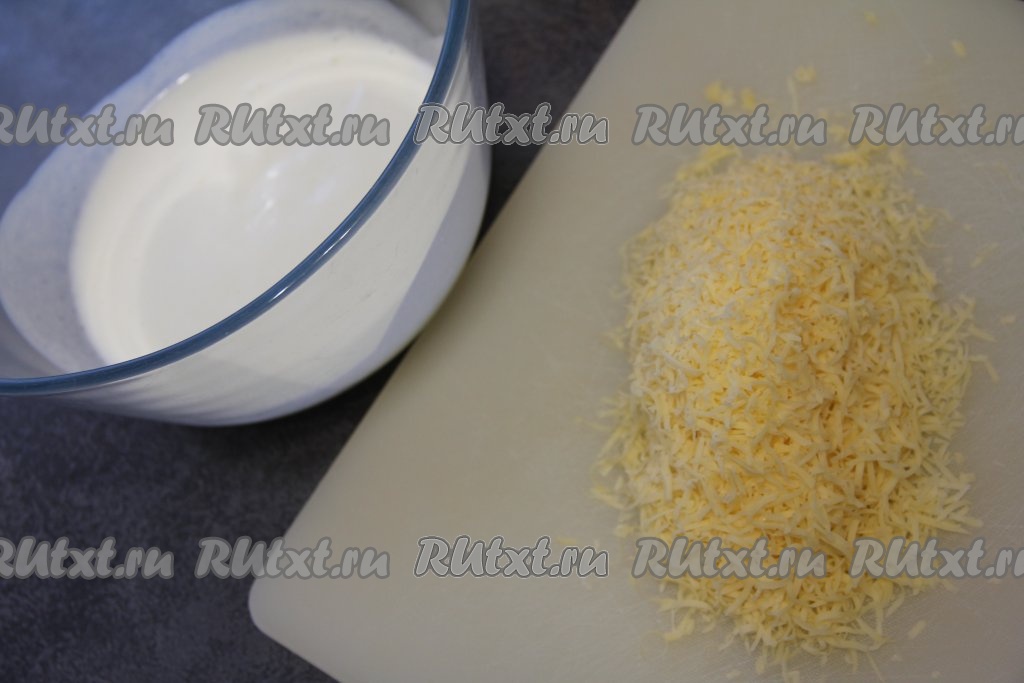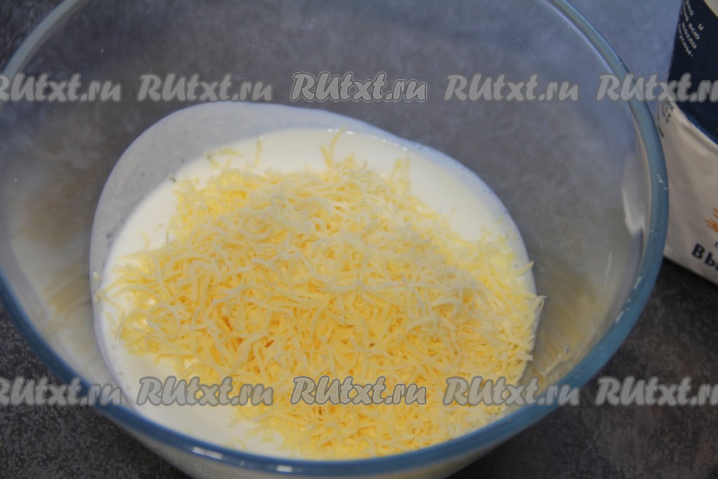 Влить кефир в миску, в которой будете замешивать тесто, добавить соду, перемешать и оставить минут на 5 (за это время сода погасится в кефире). Сыр натереть на мелкой тёрке.