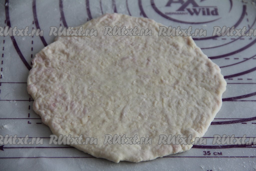 ​​​​​​​​​​​​​​Затем перевернуть сырную лепёшку и раскатать скалкой.
