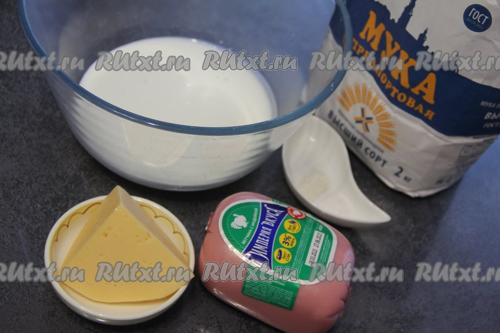 Подготовить продукты для приготовления сырных лепёшек на кефире с ветчиной.