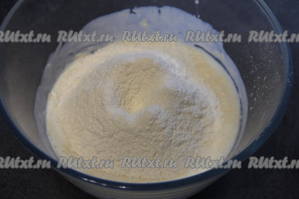 Всыпать соль, сахар и часть муки, перемешать. Постепенно начать добавлять оставшуюся муку, сначала перемешивая сырное тесто ложкой, а затем вымесить его руками.