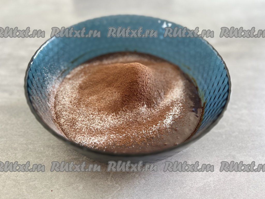 В получившуюся смесь просеиваем какао, начинаем частями добавлять просеянную муку, каждый раз тщательно вмешивая лопаткой (или ложкой).