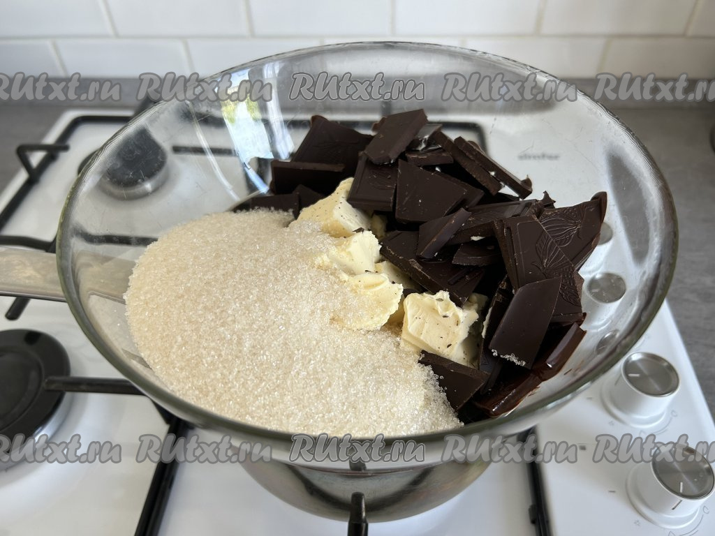 Тесто для брауни начнём готовить на водяной бане, поэтому заранее поставим сотейник с водой на огонь, даём воде закипеть. В отдельную глубокую миску кладём сливочное масло, нарезанное на кубики, всыпаем сахар и добавляем 200 грамм тёмного шоколада, разделённого на дольки. Миску с шоколадом, сахаром и маслом ставим поверх сотейника с закипевшей водой. Кипящая вода в сотейнике не должна касаться дна миски. Нагрев содержимого миски должен происходить исключительно за счёт пара от закипевшей в сотейнике воды. Уменьшаем огонь.