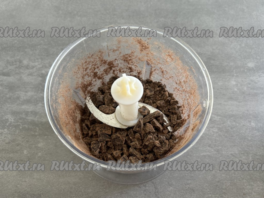 Оставшиеся 100 грамм тёмного шоколада измельчаем на небольшие кусочки. Для этого можно воспользоваться блендером, либо порубить ножом. Измельчённый шоколад добавляем в тесто и тщательно перемешиваем.