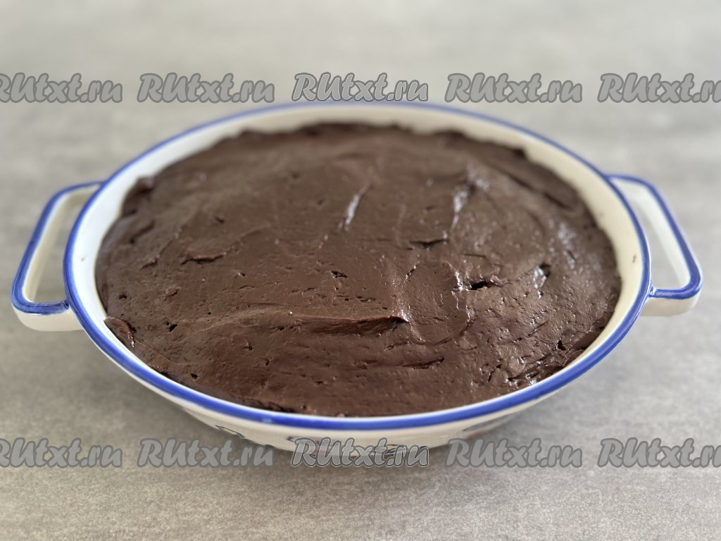 Форму для запекания (я взяла форму размером 18х23 сантиметра) смазываем растительным маслом, перекладываем в неё тесто, разравниваем. Ставим шоколадный брауни выпекаться в разогретую до 150 градусов духовку на 50 минут, затем температуру увеличиваем до 170 градусов и готовим ещё 10 минут.