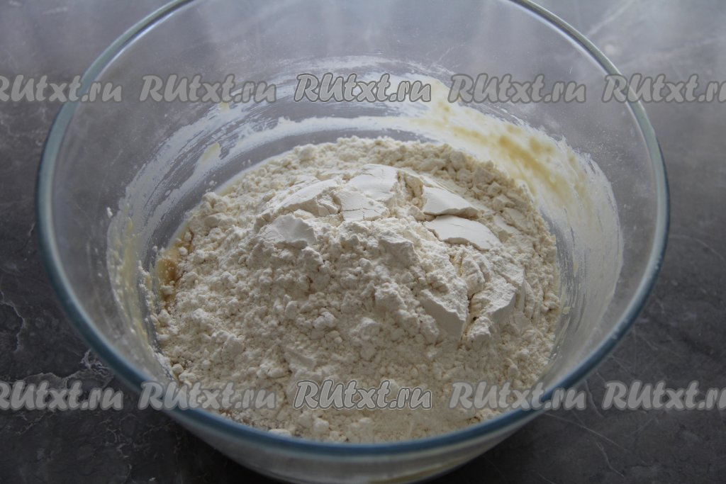 Постепенно начать всыпать просеянную муку, сначала перемешивая тесто для бубликов столовой ложкой. А затем, добавляя частями муку, вымесить тесто руками в течение 5-7 минут.