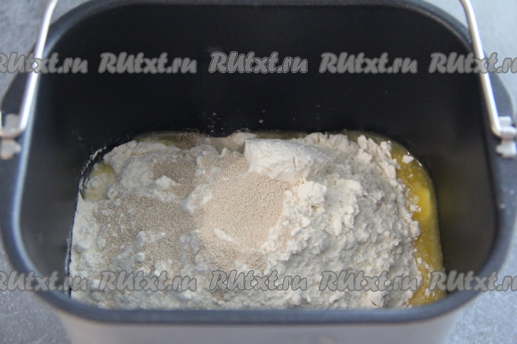 Сливочное масло растопить, дать ему немного остыть и влить в ведёрко хлебопечки. Всыпать муку и сухие дрожжи, крышку хлебопечки закрыть, выставить режим "Тесто" (у меня этот режим длится 1 час 20 минут). В процессе замешивания теста следите за формированием колобка, если он будет сильно липнуть к стенкам, тогда всыпьте немного муки.