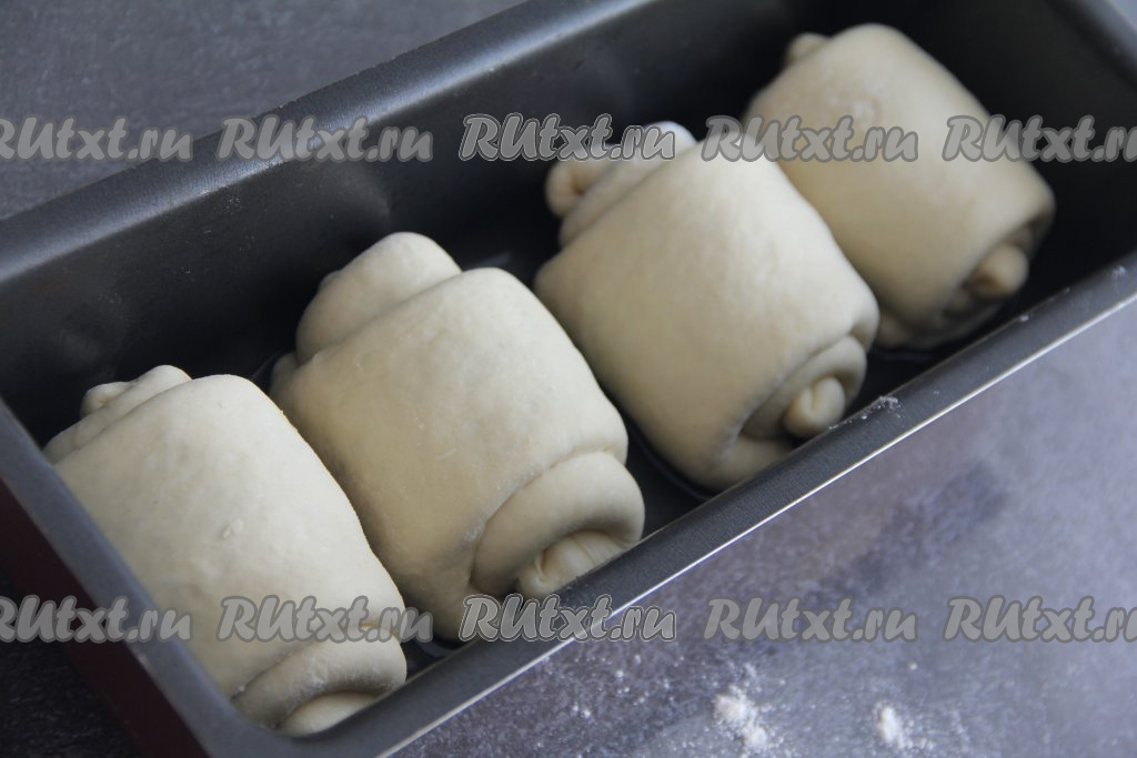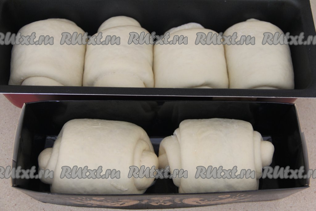Выложить заготовки японских булочек "Хоккайдо" в форму (лучше выкладывать заготовки булочек на небольшом расстоянии друг от друга). Я выпекала 4 штуки в форме для хлеба и 2 булочки в отдельной форме.