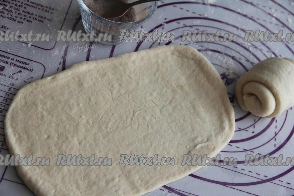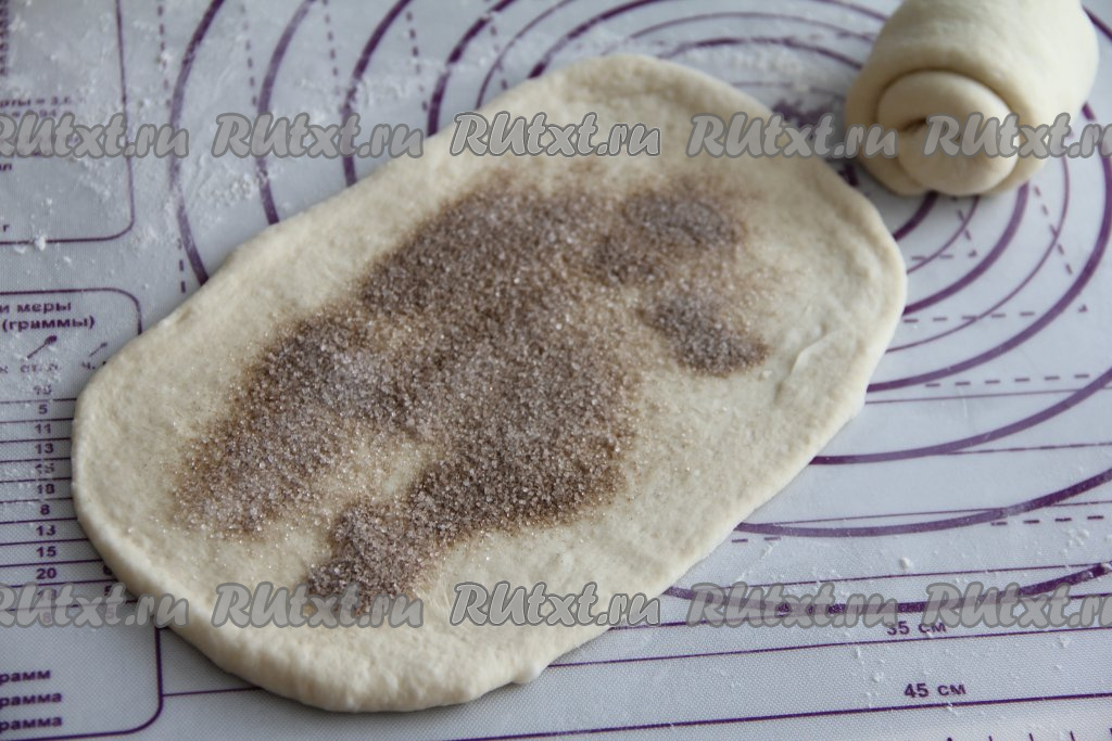 Для приготовления начинки соединить сахар и корицу, перемешать и зрительно разделить начинку на 6 частей (по количеству частей теста). Присыпать раскатанный овал одной частью начинки из корицы и сахара, немного отступив от краёв.