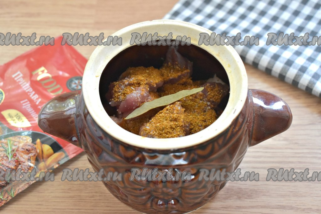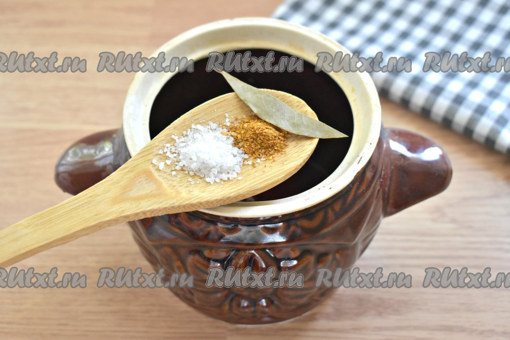 На дно горшочка всыпаем половину чайной ложки приправы для мяса, щепотку соли, добавляем половину лаврового листа.