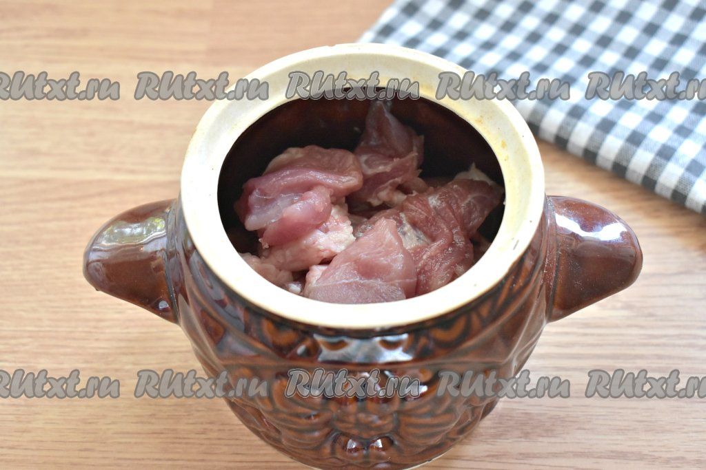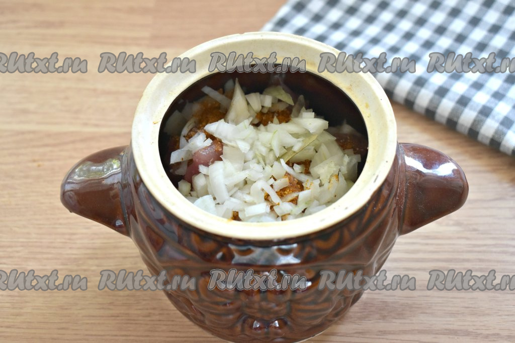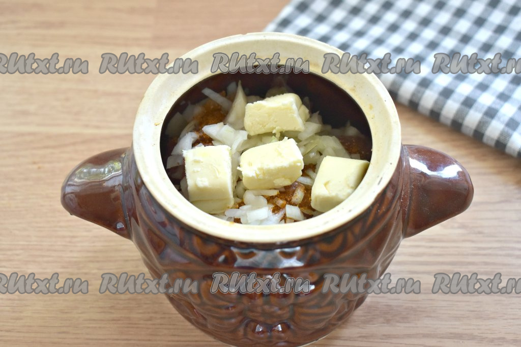 Поверх лука кладём кусочки сливочного масла. Воду добавлять не надо, свинина будет тушиться в собственном соку в горшочке.