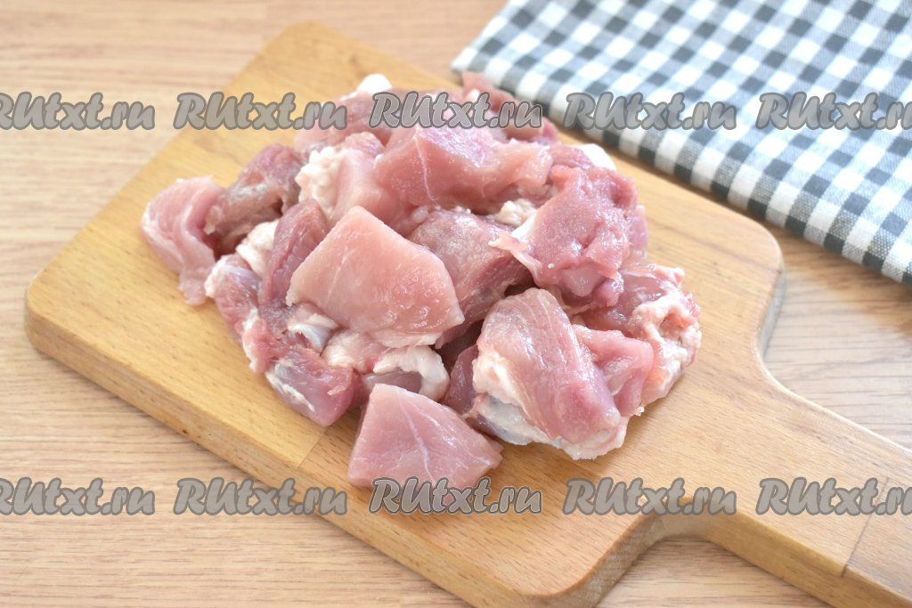 Мякоть свинины моем, затем обсушиваем и нарезаем на небольшие кусочки (примерно со сторонами по 2 сантиметра).