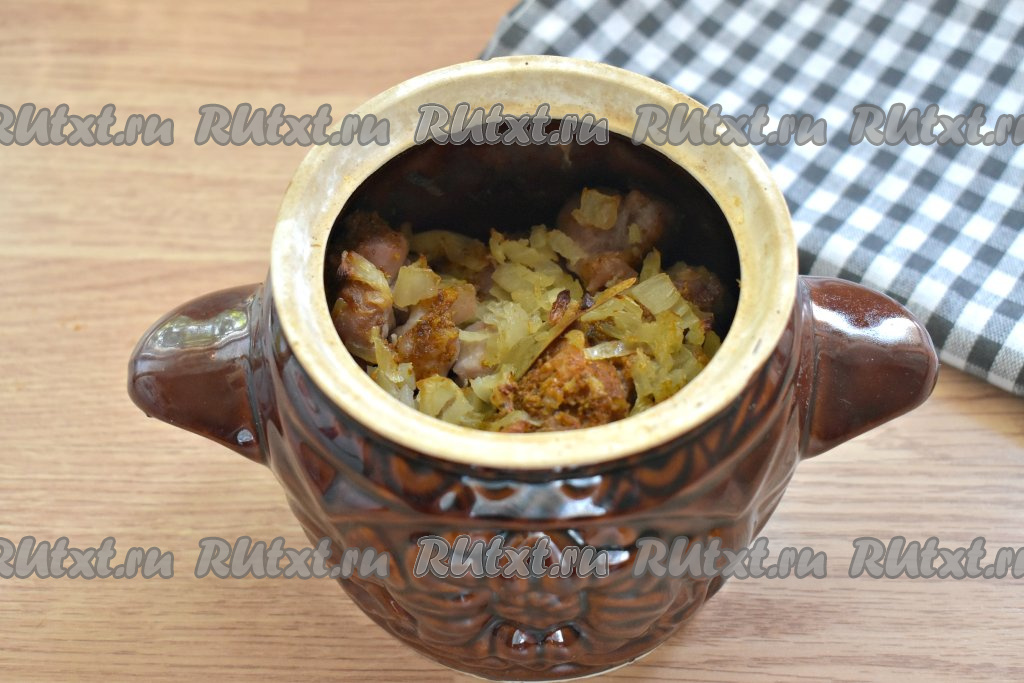 Горшочек закрываем крышкой и ставим в холодную духовку. Включаем духовку на 180 градусов и оставляем свинину тушиться с луком в горшочке в течение 1 часа 45 минут.