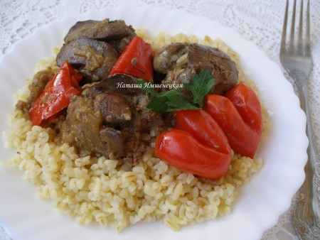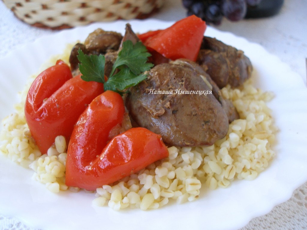 Куриная печень, тушёная с болгарским перцем, получилась нежной, мягкой. А красный сладкий перец отлично дополнил и украсил вкус печёнки. К столу это аппетитное блюдо подаём с гарниром на ваш выбор (я подала с булгуром).