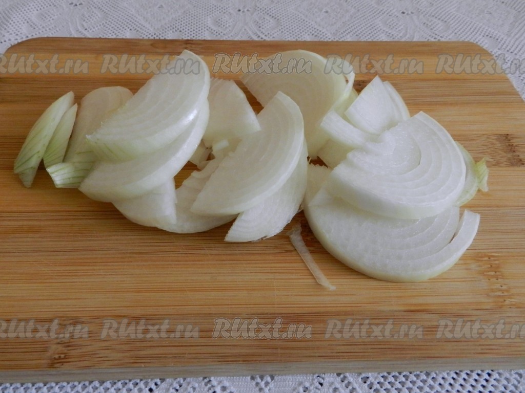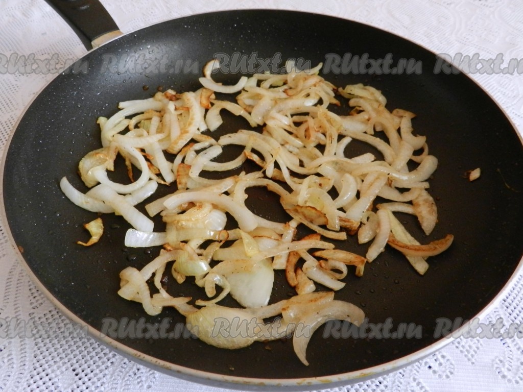 На сковороде разогреть растительное масло, выложить нарезанный лук и обжарить его, помешивая, на среднем огне до золотистого цвета.