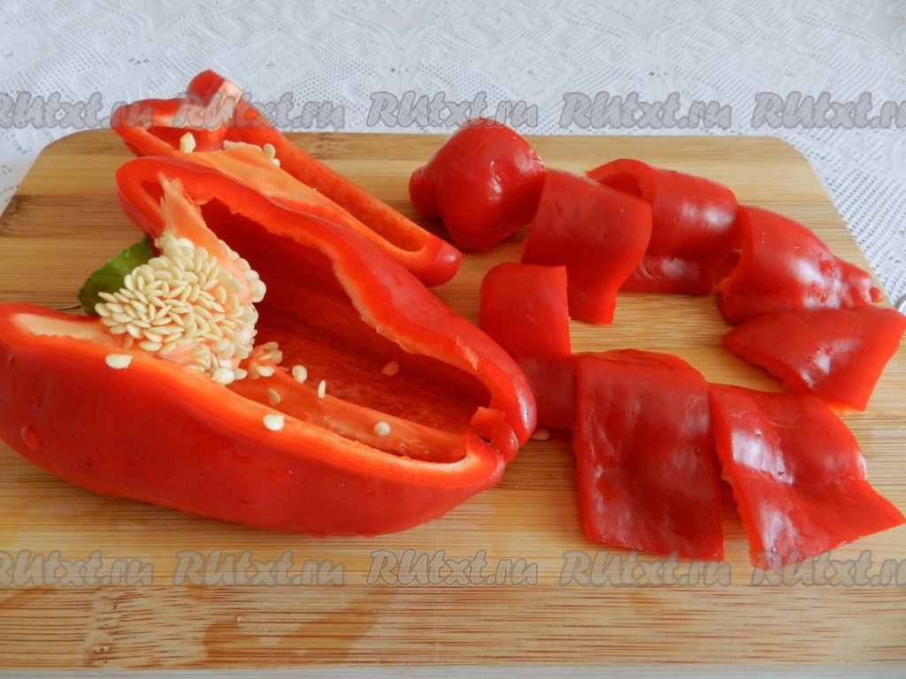 Перец очистить от семян и нарезать достаточно крупно. Я предпочитаю готовить куриную печень со сладким болгарским перцем красного цвета, тогда блюдо получается более ярким.