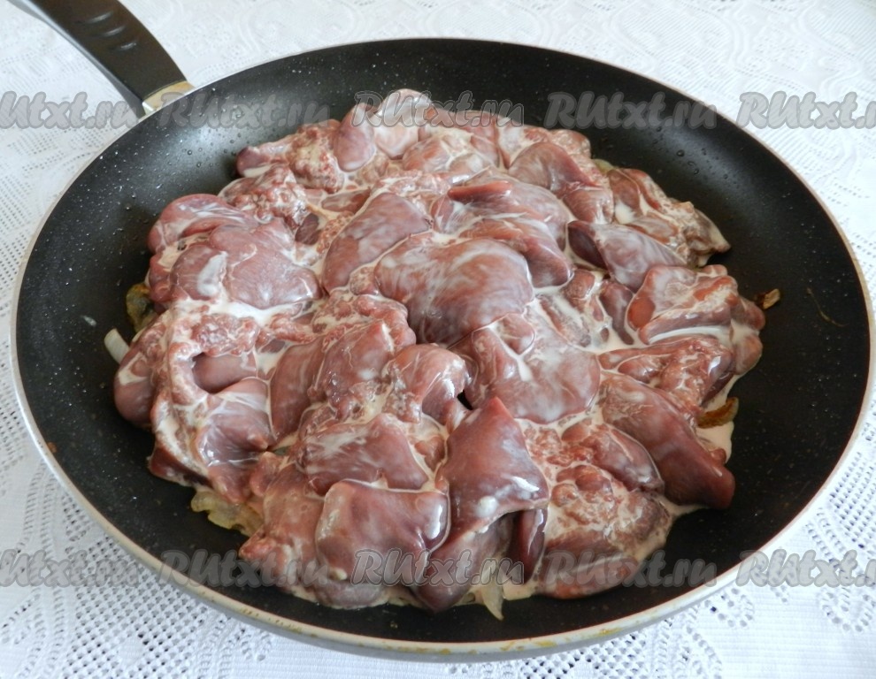 Куриную печень вымыть, выложить в миску, залить молоком (или сливками) и оставить на 1 час. Печень, вымоченная в молоке (или сливках), в готовом блюде получится более мягкой и нежной.
