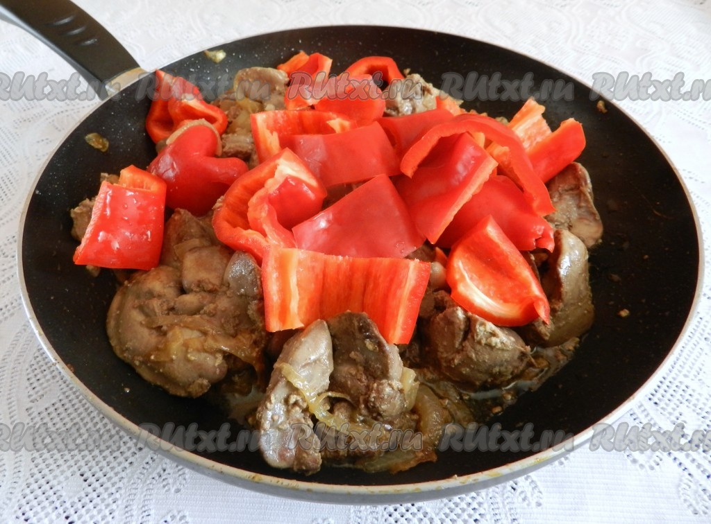 Добавить к куриной печени нарезанный болгарский перец, перемешать и обжаривать на сковороде до готовности печёнки (в течение 3-4 минут). Для того чтобы проверить готовность, разрежьте кусочек печени, если из разреза выделяется прозрачный сок без примесей крови, значит печёночка готова.