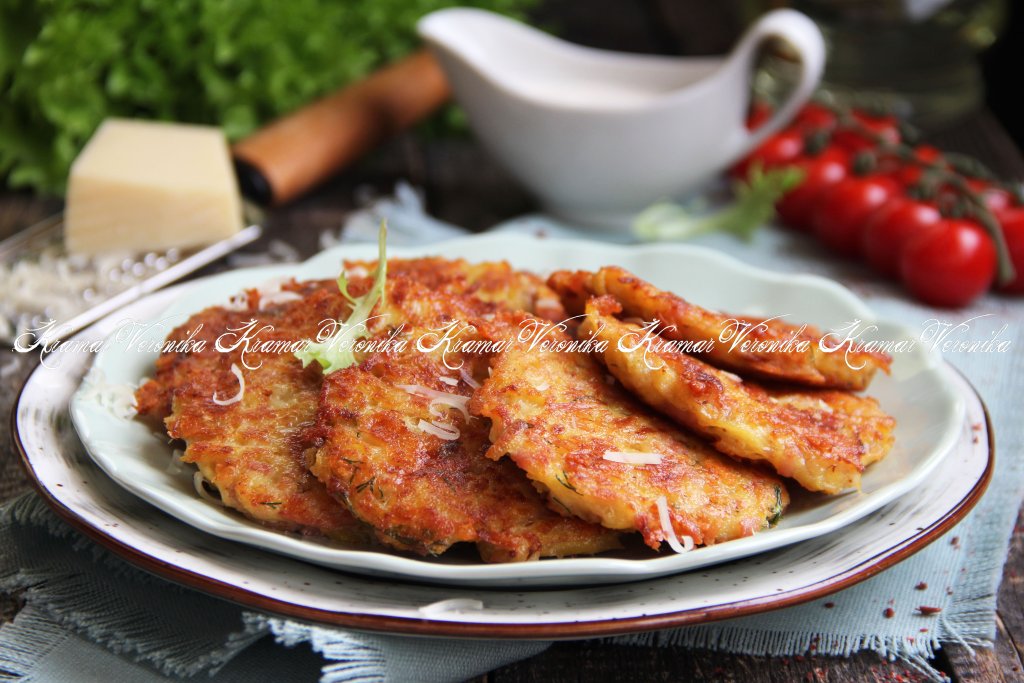 Вкусные, аппетитные, нежнейшие картофельные драники, приготовленные с добавлением сыра и ветчины, подать к столу горячими, дополнив сметаной или любимым соусом.