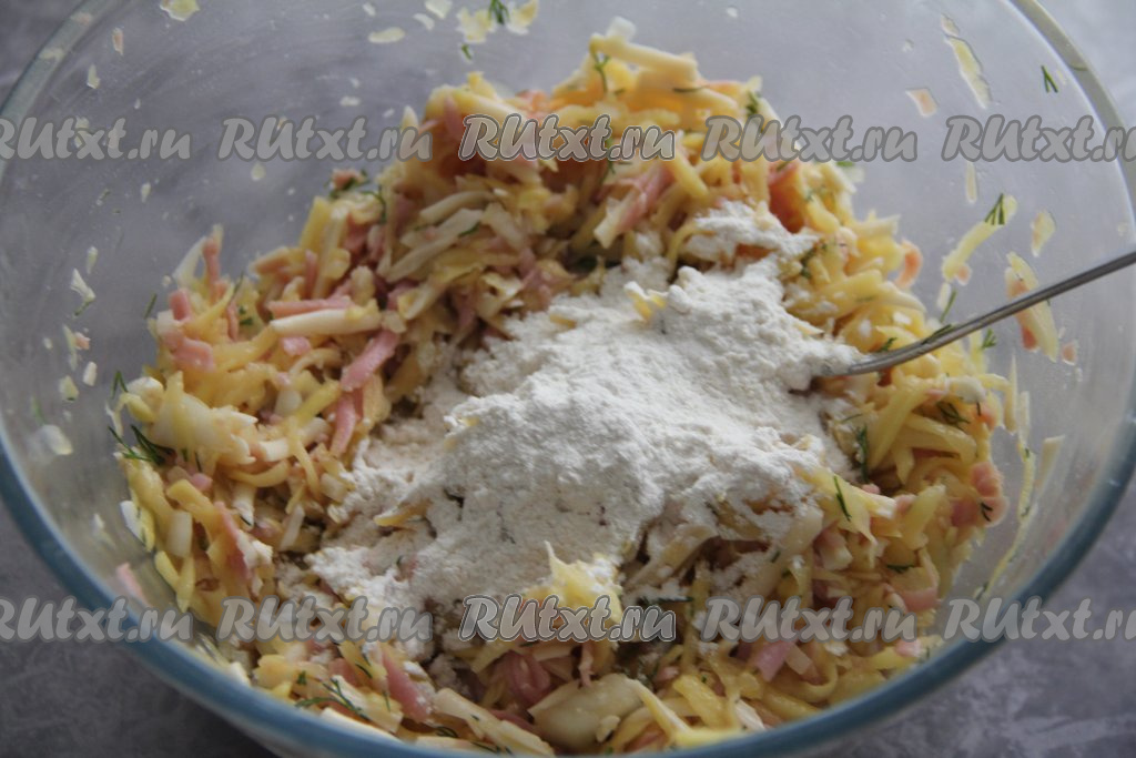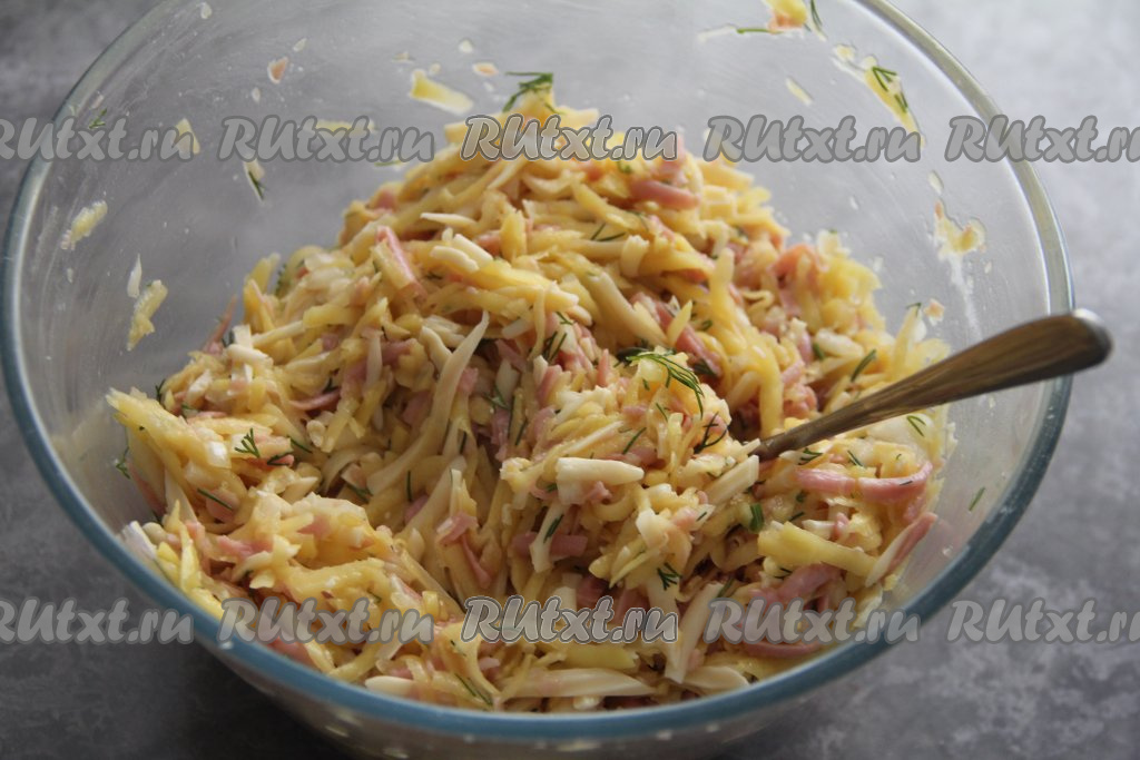 Ветчину и сыр натереть на крупной тёрке и тоже добавить в миску с картофелем.