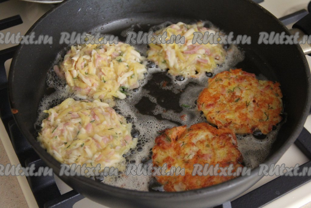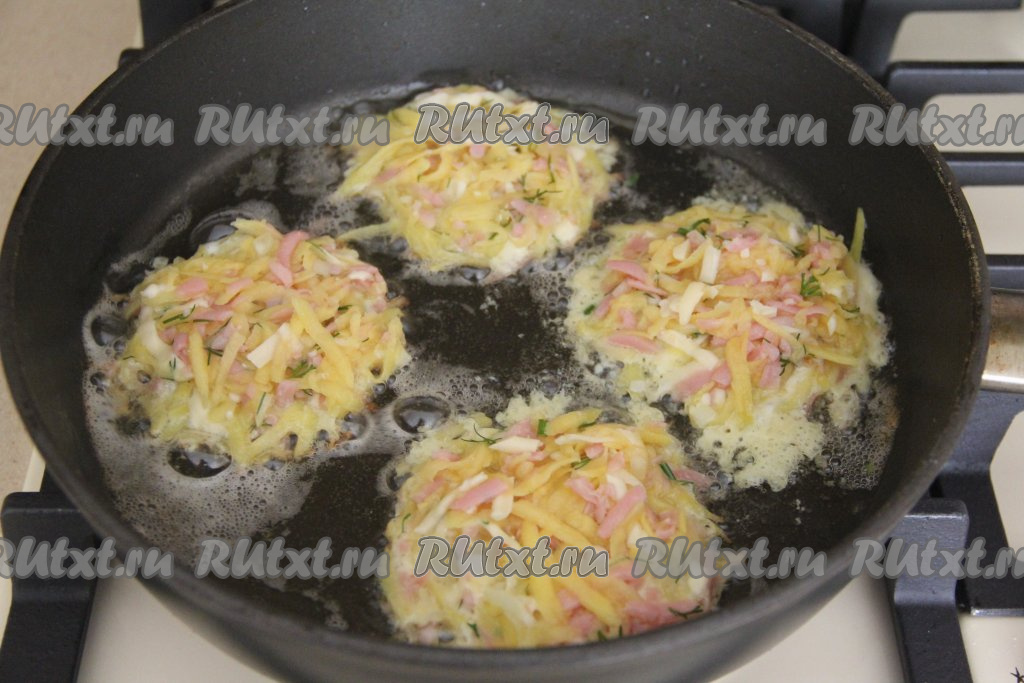 Хорошо разогреть растительное масло в сковороде, уменьшить огонь до среднего, а затем выкладывать по 1,5 столовых ложки теста из картошки, ветчины и сыра, формируя круглые драники.