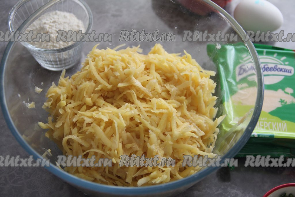 700 грамм очищенного картофеля натереть на крупной тёрке, отжать выделившийся сок (картофельный сок нам не понадобится). Получившуюся картофельную массу переложить в объёмную миску.