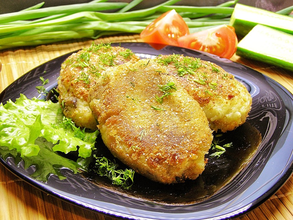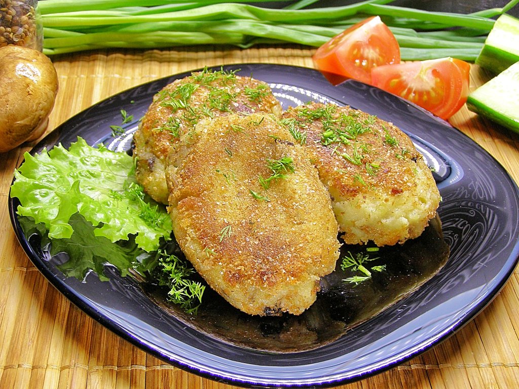 Вкусные, мягкие, ароматные картофельные котлеты с грибами лучше всего подавать в горячем виде со сметаной, свежими овощами, зеленью или в качестве гарнира к мясным и рыбным блюдам.