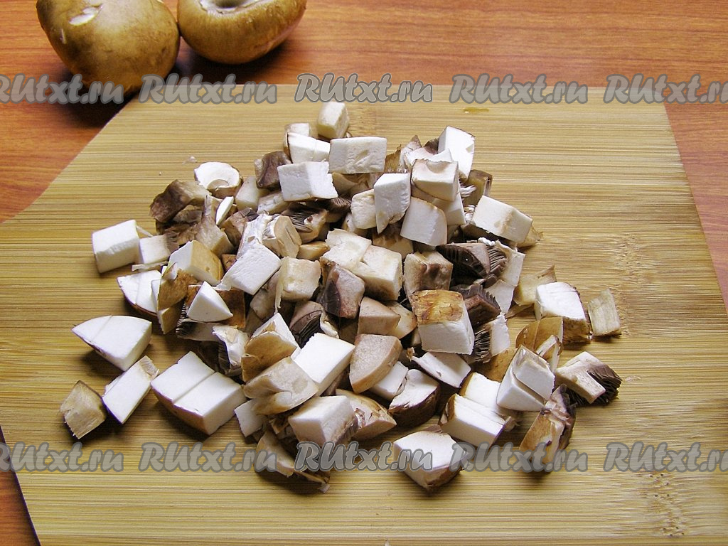 Грибы для этого блюда можно взять любые, подойдут как лесные грибы, так и шампиньоны или вешенки. Лесные грибы необходимо предварительно отварить в течение 25-30 минут с момента закипания воды, после этого лишнюю воду нужно будет слить, а затем крупные грибочки нарезать на части. Шампиньоны или вешенки отваривать не нужно, достаточно будет промыть их водой и нарезать на средние кубики.