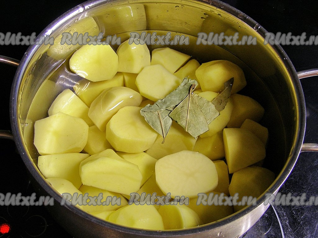 Картофель моем, очищаем от кожуры и кладём в кастрюлю (крупные клубни можно разрезать на 2-4 части), заливаем полностью холодной водой, солим по вкусу, добавляем лавровые листья и ставим на сильный огонь. Доводим до кипения, затем варим картошины на небольшом огне минут 20-25 (до готовности). Готовый картофель должен легко прокалываться ножом.