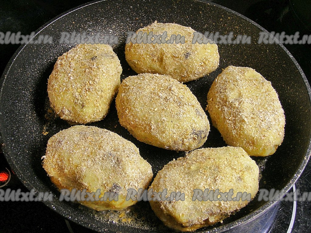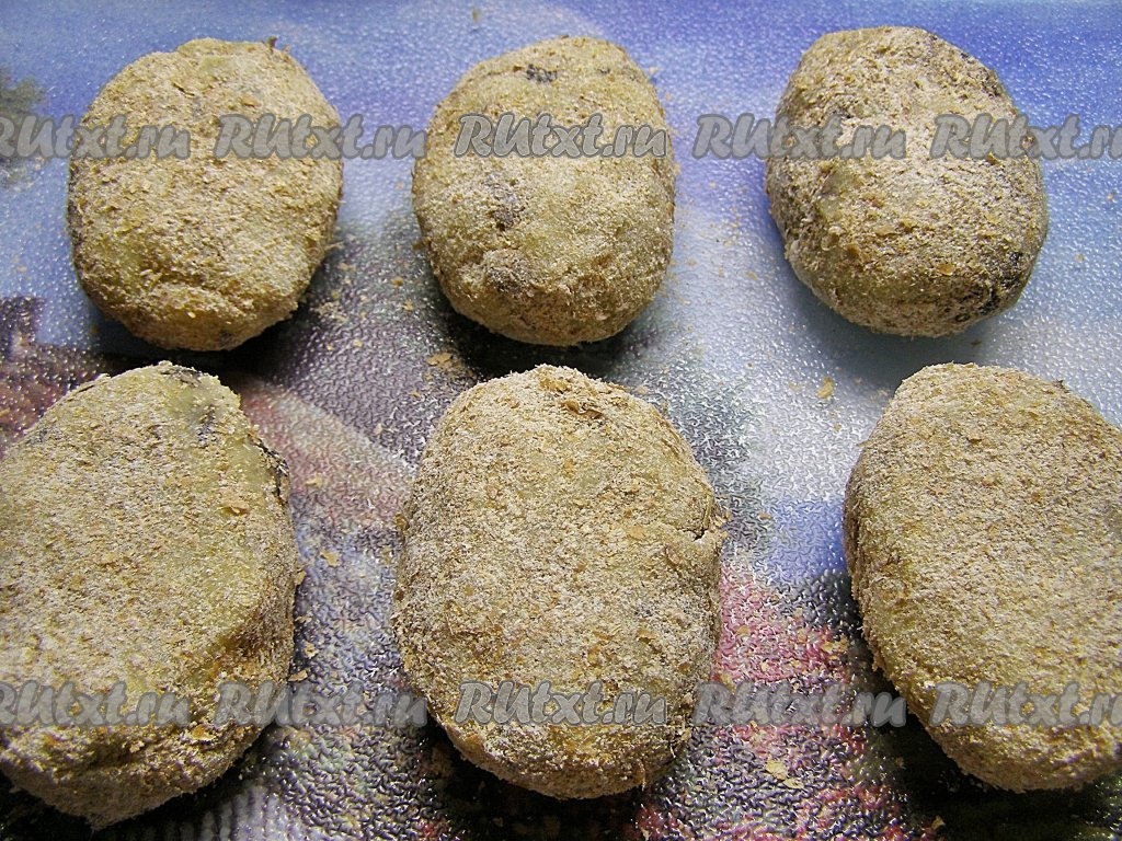 Каждую сформированную картофельную котлету с грибами обваливаем со всех сторон в панировочных сухарях.