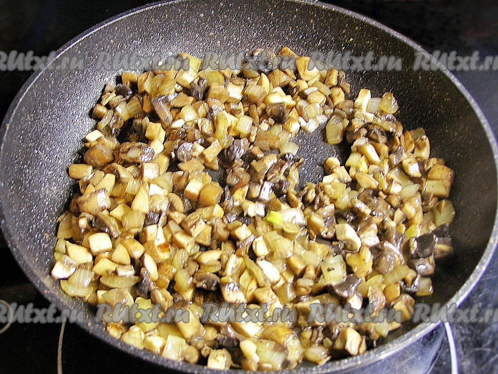 В сковородке на растительном масле сначала обжариваем лук, помешивая, до прозрачности (в течение 3-4 минут), затем кладём подготовленные грибы, перемешиваем, слегка солим и обжариваем, периодически перемешивая, минут 10 (до готовности грибов), снимаем с огня, даём остыть.