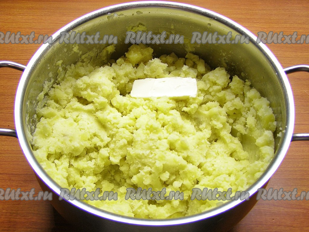 Сливаем с картофеля воду, разминаем толкушкой до получения пюре, затем добавляем сливочное масло и хорошо перемешиваем. Оставляем пюре немного остыть.