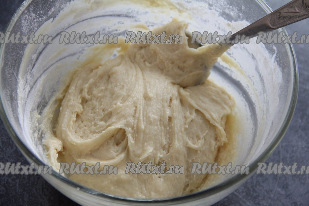 Перемешать тесто лопаткой, оно получится тягучим и вязким.