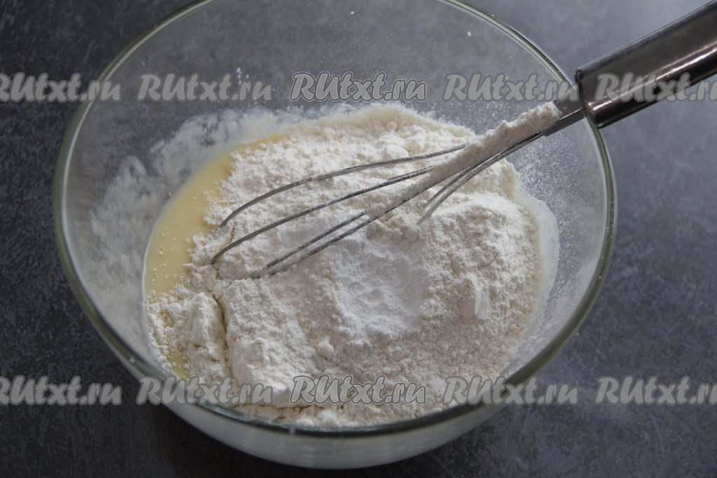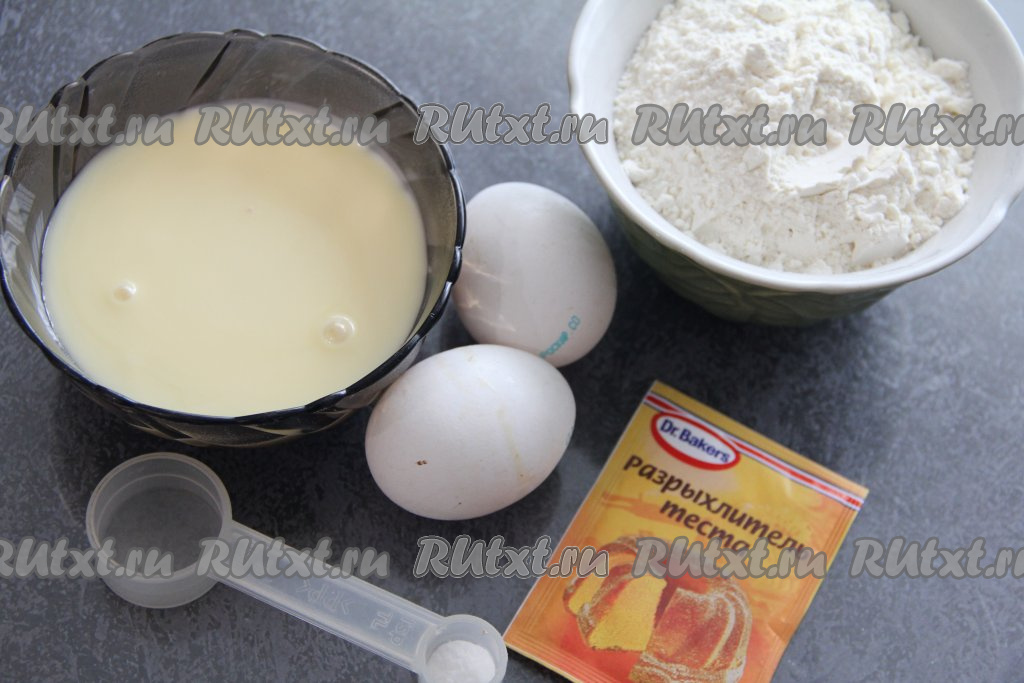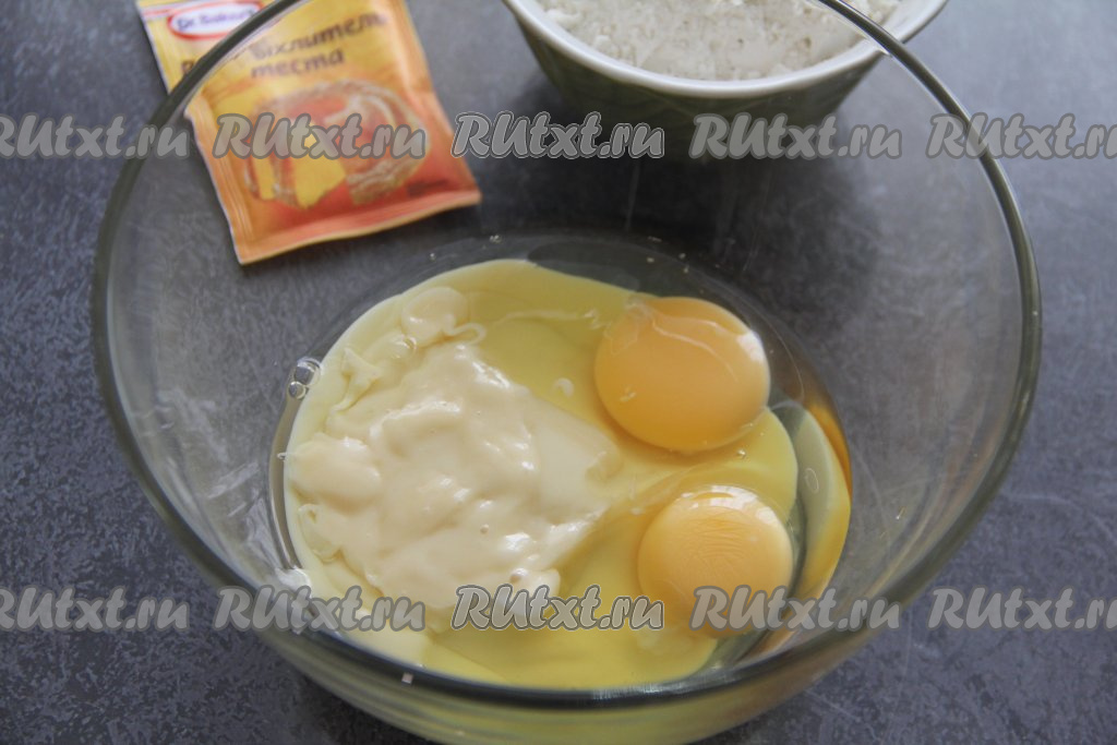 В миске соединить сгущённое молоко и яйца, перемешать венчиком.