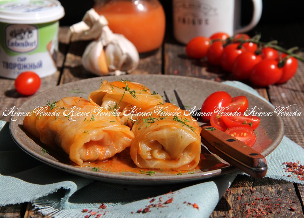 Аппетитные, вкусные, нежные голубцы подать к столу, поливая их томатным соусом, в котором они тушились.